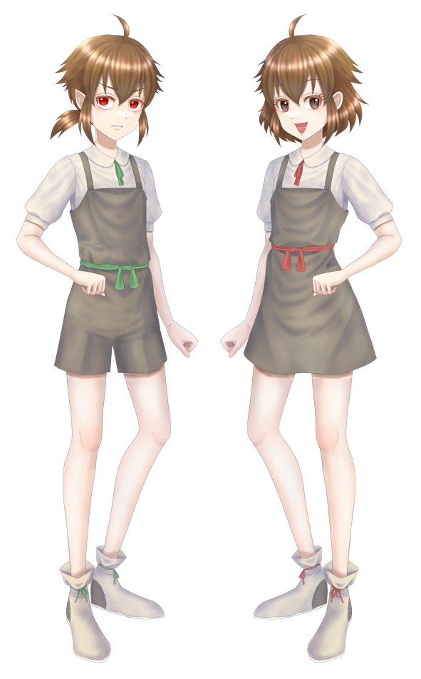 では、森の中のほうからバタバタとやってくるのがですね、双子の男の子と女の子です。ヨーロッパの田舎風の服を着ています。少女のほうが大きな袋を持っていて、何か森で収穫してきたところっぽい感じがします。で、少年のほうが赤い目で吸血鬼。少女のほうは人間ですね